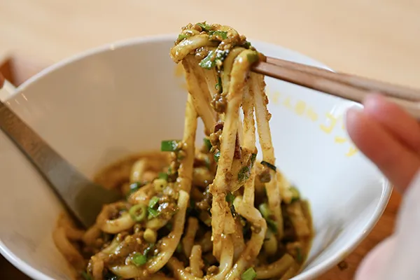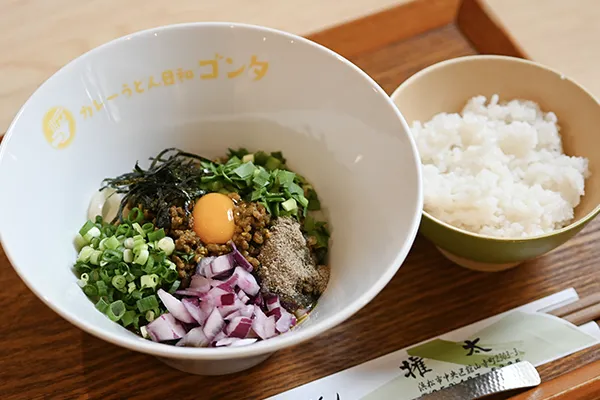 本格スパイス×出汁の旨みが効いた濃厚肉味噌に、ピリッとシビれる辛さがやみつきになります。麺とよく混ぜて食べた後は、残ったカレーにご飯を入れてシメるのがオススメです。夏バテも吹き飛ぶゴンタの自信作です。舘山寺門前通りで夏のパワーチャージ、いかがですか?
